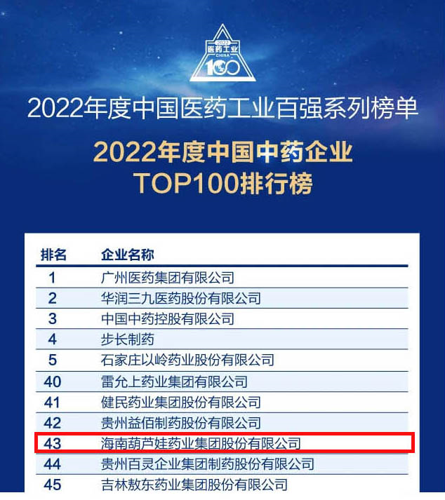 公海赌船710药业集团连续4年荣登“中国中药企业TOP100排行榜”,排名上升至第43位